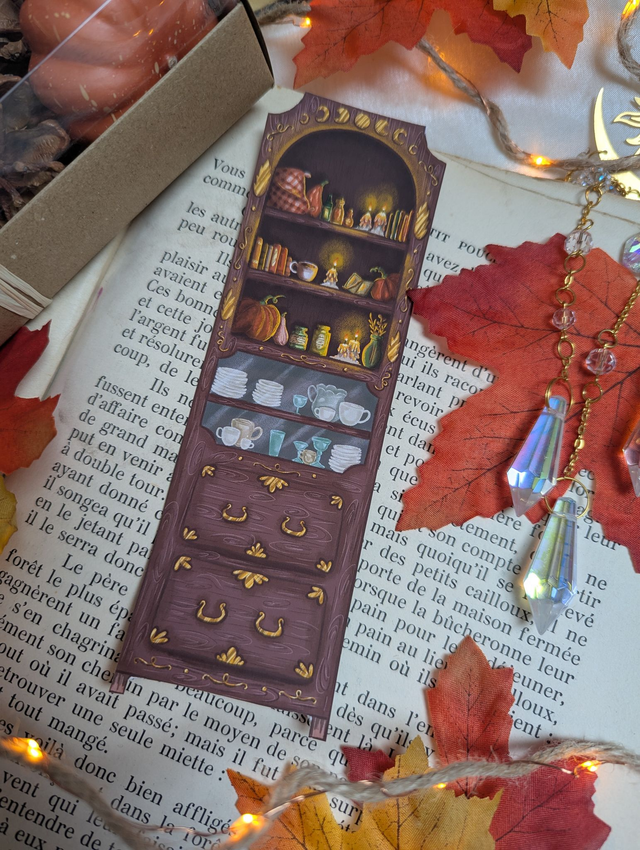 Ce marque-pages illustré dévoile une étagère de sorcière remplie de grimoires, potions, bougies et objets magiques, comme un petit cabinet secret où reposent tous les sortilèges...🔮🍂
