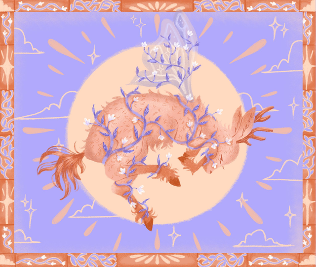 Une illustration délicate représentant une biche onirique, parée de fleurs et baignée de lumière céleste. Symbole de douceur et de sérénité, cette biche semble danser entre rêve et nature enchantée...