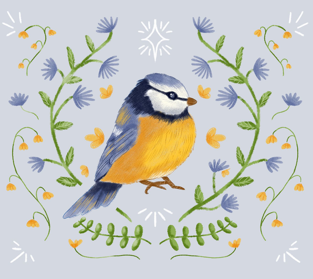 Lorsque les premiers jours doux s’installent, la nature s’éveille. Plongez au cœur du printemps avec cette mésange bleue, messagère du renouveau, entourée de bleuets délicats et petites fleurs dorées. Une illustration qui évoque la légèreté d’un matin ensoleillé et des prairies en fleur.